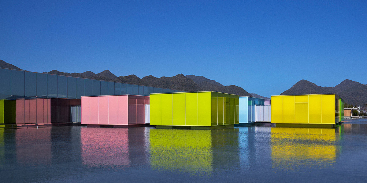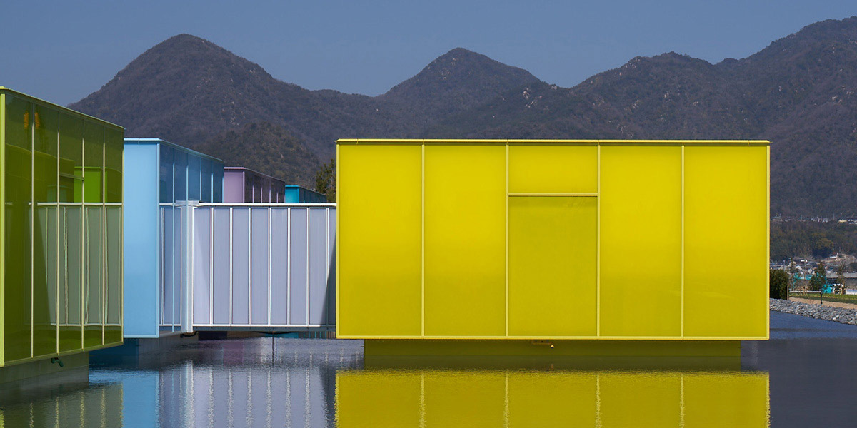 The walls of the exhibition hall are rearranged for each exhibition. The eight movable galleries that sit within the water basin were conceived by Shigeru Ban with inspiration from the islands of the Seto Inland Sea. Incorporating Hiroshima's shipbuilding technology, this unique architectural design allows the galleries to be moved by floating them on the water.